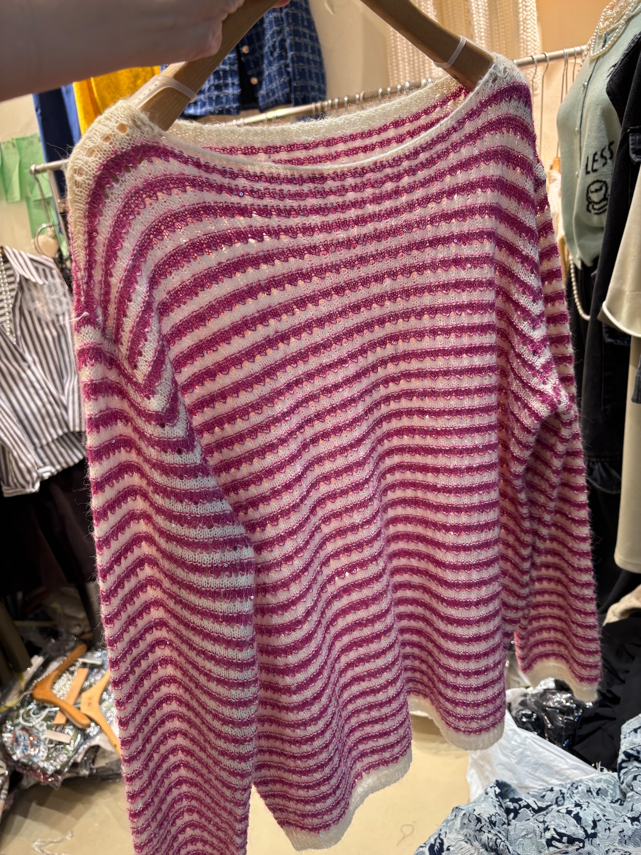 柔らかなピンクのボーダーニットは、リラックスしたスタイルを引き立てながらも、華やかで明るい印象を与えます。肌に優しい素材感が特徴で、季節の変わり目でも快適に着用できる一品です!